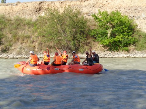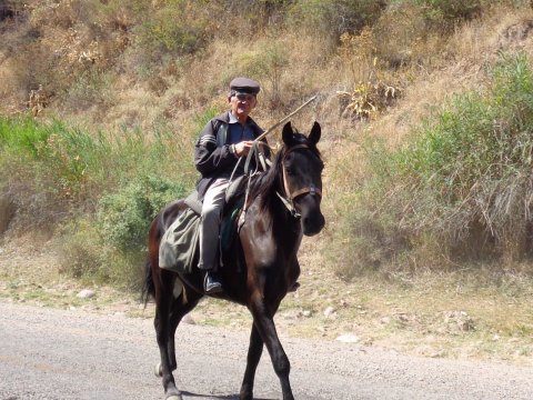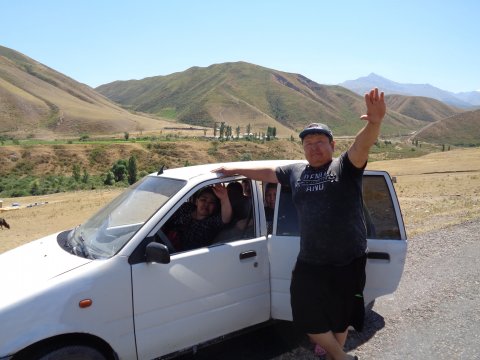 På min vej op gennem dalen Isik-Ata mødte jeg den joviale hr. Rosta med familie. De havde været på picnic oppe i bjergene. Nu på tilbagevejen havde de købt honning hos en af de talrige biavlere, som holder til i den nederste del af dalen. Blomsterne, der står i flor fra maj til juli, er blomstret af nu, men honningen skal også slynges og sælges, så biavlerne har rigeligt at lave. Rosta gav mig iøvrigt generøst sit mobilnummer, så jeg kunne ringe efter hans hjælp, hvis behovet opstod. Rostas to teenage børn ville ikke med på fotoet. De syntes (som det vel åbenbart står foreskrevet i "Håndbog for Teenagere") at far var pinlig :-)