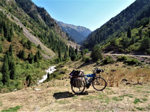 Efter 10 dage på cykelsadlen er jeg nu fremme i Karakol, en relativt lille by, som ligger i den østligste del af Kirgisistan tæt på grænsen til både Kazakstan og Kina. Temperaturen er faldet dramatisk, siden jeg startede min tur. Da jeg landede den 8. August i Bisjkek, Kirgisistans hovedstad, havde vi første eftermiddag 37 grader i skyggen. Mens jeg i går, på det sidste stykke vej mod Karakol, måtte tage til takke med kølige 12 grader og småregn. Heldigvis har jeg tøj og udstyr med til al slags vejr. Senere på turen, når jeg for alvor kører op i bjergene, kan jeg regne med frost om natten og tillige være indstillet på, at jeg skal kunne klare mig selv i flere dage i træk. Det betyder så, at cyklen fx skal lastes med den nødvendige mængde mad til turen. I bjergene er der sædvanligvis vand nok, for det kan hentes og ofte drikkes direkte fra de fleste floder og vandløb.
