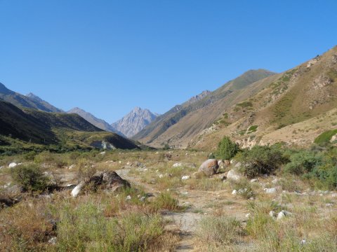 Kegetidalen: mit mål på anden cykeldag. Vejen videre op gennem dalen går slutteligt over det 3800 meter høje Kegeti-pas. Inspireret af to andre cyklister jeg mødte, følte jeg mig fristet til at fortsætte mod højderne. Jeg valgte dog at holde mig til min oprindelige plan om først at køre mod øst til søen Isyyk Kul og byen Karakul. Passet kan jeg så eventuelt gemme til hjemturen, hvor jeg så vil komme fra sydsiden. Til den tid har jeg vænnet mig til højderne, og min kondition vil utvivlsomt være betydeligt bedre.