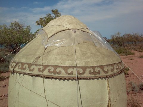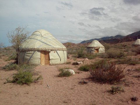 Jurter er de traditionelle centralasiatiske telte, som er beklædt med filt fremstillet af fåreuld. Disse flotte eksemplarer, som jeg fandt ved Isyyk Kuls søbred, bruges ikke på traditionel nomadevis, men lejes ud til os turister. I regn og blæst benytter nutidens jurtefolk moderne teknologiske velsignelser som fx plastfolie og nylonreb. Det gør de klogt i, for vi moderne vestlige turister er måske nok romantisk indstillede, men kun for såvidt det ikke drypper på vores dyre gåseduns-soveposer.