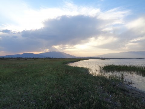 Et par dage senere slog jeg lejr ved bredden af søen Isyyk Kul. Søen, der ligger 1600 m.o.h og måler 160 x 60 km, er en af de største alpine søer i verden. Navnet betyder "varm sø", og det skal tages helt bogstavligt, for selv under de ofte meget kolde vintre fryser søen ikke til. Videnskaben siger, at det skyldes termisk aktivitet under søbunden. De lokale har altid ment, at der var sprækker i bunden helt ind til jordens indre. Hvilket vel næsten er det sammen. Jeg befinder mig altså i et jordskælvsfølsomt område... øh...spændende!