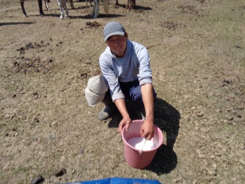Storebror har lige malket en hoppe. Af mælken fremstilles kumys, en kirgisisk alkoholisk specialitet. Mælken opbevares i en beholder et par dage, før den blandes med frisk mælk og sættes til gæring på et varmt sted. Processen omfatter lidt flere tiltag, men resultatet er en let alkoholisk drik, som kirgiserne holder meget af. I sommerhalvåret sælges den fra jurter (de traditionelle mongolske filttelte) ved vejsiden til ivrige forbipasserende. Drikken menes at være helsebringende. Hvilket måske siger lidt om, at den ikke smager alt for godt :-) Den russiske forfatter Leo Tolstoy drak Kumys, når han følte sit helbred vakle.