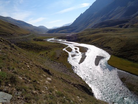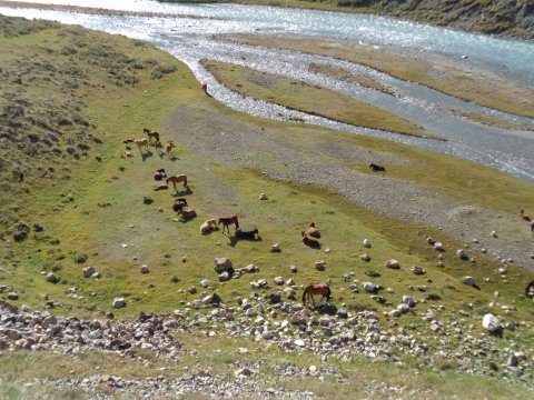 Nedkørslen fra passets sydside var hurtigt overstået, for Arabeldalens bund, hvor floden Jyluu-Suu løber, ligger højt. De næste 3-4 dage fulgte jeg floden på dens løb mod vest. Undervejs støder den til floden Naryn, en af Centralasiens største floder.