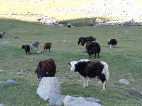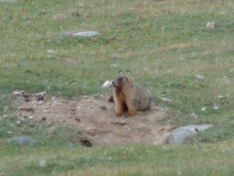 En koloni af murmeldyr beboede engen. De pev og hylede og smuttede ned i deres huller, da jeg kom rullende på min yak-okse af stål. Tilsidst blev jeg dog tolereret, og vi lod hinanden i fred hele natten.