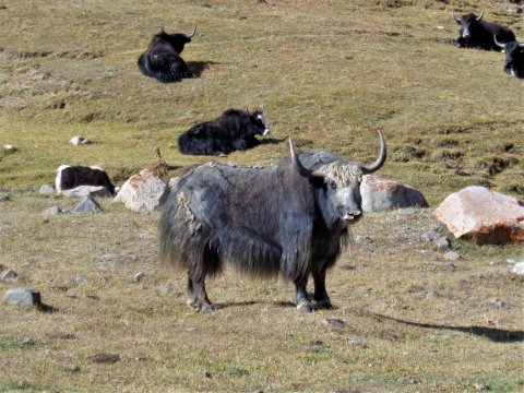 Kort før passet så jeg de første store flokke yak-okser. De ser drabelige ud, men er ganske fredelige.