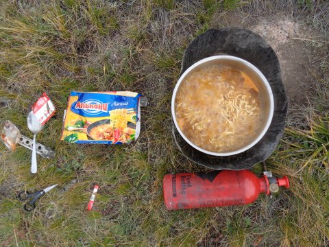 Efter en lang, anstrengende dag på cyklen er en grydefuld minutnudler et rigtigt herremåltid. Ganske som når man bruger en suppe-sten, bliver anretningen bestemt ikke dårligere af, at man tilsætter løg og hakkede tomater :-) Foruden disse praktiske små nuddelpakker medbringer jeg typisk brød, ost, chokolade, sardiner på dåse plus te, kaffe og sukker.