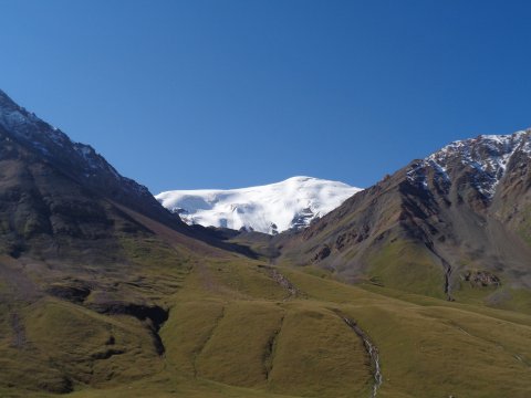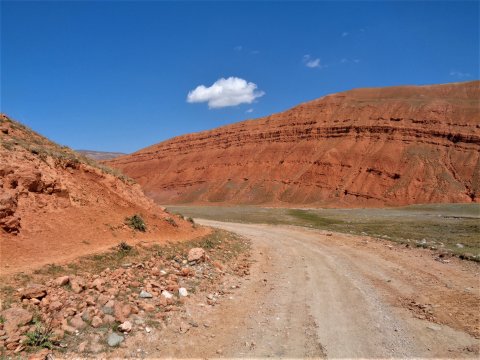 Kommer du fra syd, skal du over det 3350 meter høje bjergpas, Moldo-Ashuu. Jeg tog fat på turen efter en nat i teltet ved pasvejens fod, og efter vel omk. 5 til 6 timers træden i pedalerne - dog trækkende cyklen i ny og næ - nåede jeg sen eftermiddag toppen.