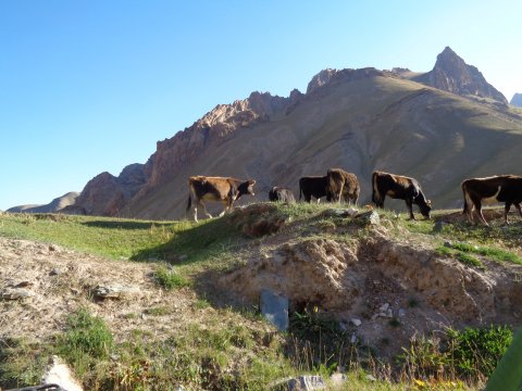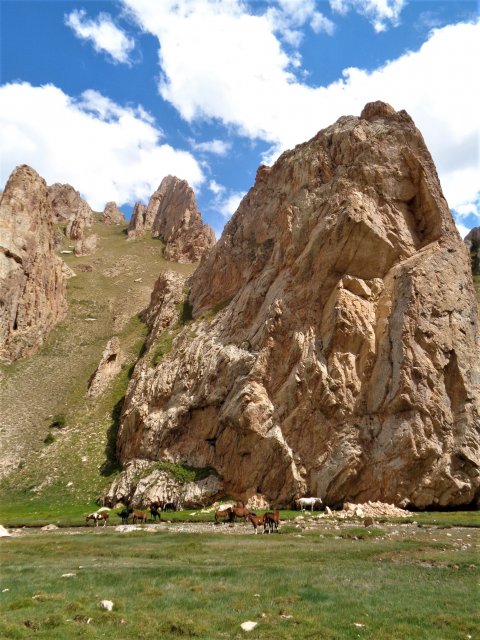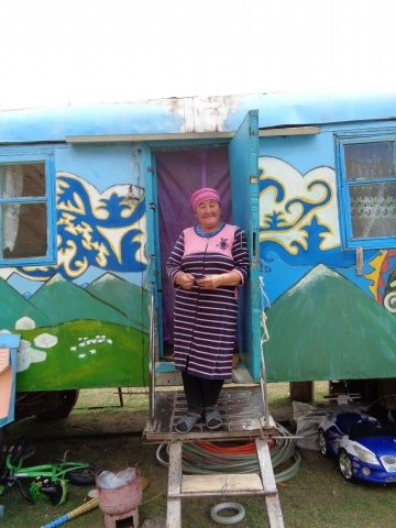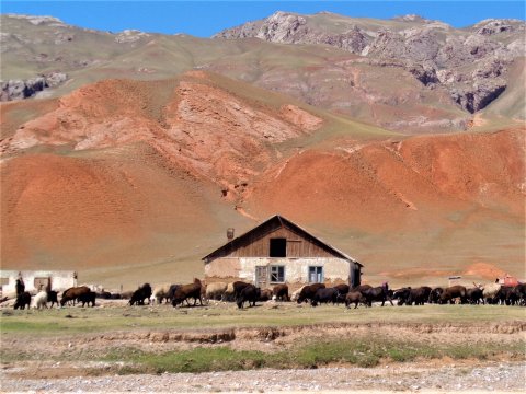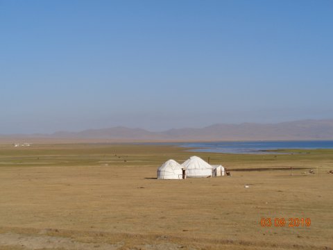 En lille familie har slået deres jurtetelte op kun et stenkast fra Tash Rabat. Mutter her har indrettet sig med sit køkken i en gammel opklodset skurvogn. Familiens flokke af heste, køer, får og geder græssede utrætteligt på de skrånende bjergsider. De fleste af familiens telte var indrettet til logi for os turister.
