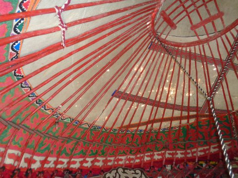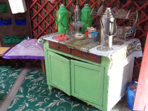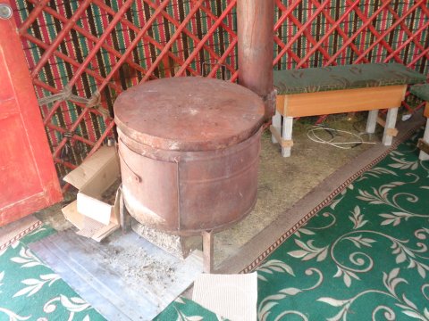 Min jurte var, som det ofte er tilfældet, meget farverigt indrettet. Der var lunende tæpper på jorden, og i en lille ovn fyrede de op for mig med stenkul eller tørrede kokasser.