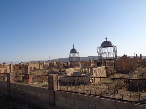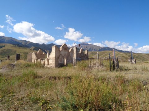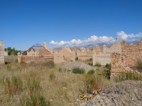 Du ser dem overalt i Kirgisistan: hvad der på afstand ligner små byer pakket med fine små lerstenshuse viser sig ved nærmere eftersyn at være gravpladser. Typisk ligger de lidt fra landsbyen, ofte på en bakkeskråning, og sædvanligvis gør de større indtryk på os vejfarende end de landsbyer, de tilhører. Gravstenene og de store mausolæer er typisk pyntet med symboler fra vidt forskellige traditioner og ideologier. Ofte prydes et og samme gravsted med både en islamisk halvmåne, en kommunistisk rød stjerne eller hammer og segl og en hovedskal fra et dyr. Det sidste som et vidnesbyrd om, at landet ikke helt har sluppet en animistisk og shamanistisk religiøs fortid. Et falmet foto eller en sirlig gravering på en gravsten af den afdøde i søndagstøj er et lån fra russiske traditioner.