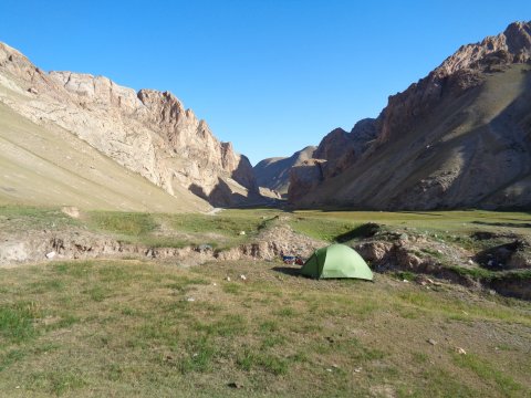 Først på eftermiddagen rullede jeg retur ned gennem den smukke Kara-Kojon kløft, hvor jeg efter lidt søgen fandt en nogenlunde flad og kokagefri plet til mit telt.