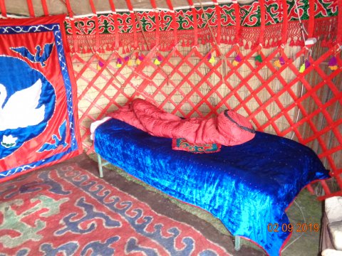 Efter min oplevelse med rytteren, og med sorte regnskyer i horisonten, havde jeg ikke lyst til at tilbringe natten i mit telt. Jeg fandt derfor en nomadefamilie, der tilbød mig logi i et jurtetelt. Et rejsehold fra Frankrig boede allerede i de fleste af teltene på stedet, og jeg fandt det befriende igen at kunne dele mine oplevelser på engelsk.
