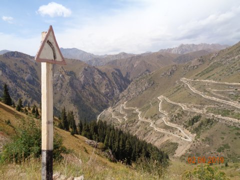 Umiddelbart før det sidste af de talrige sving mod passet havde en spøgefugl fra det kirgisiske vejvæsen opsat et skilt (det første og eneste på hele pasvejen) der oplyste os vejfarende om, at nu slog vejen et farligt sving :-)