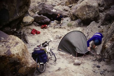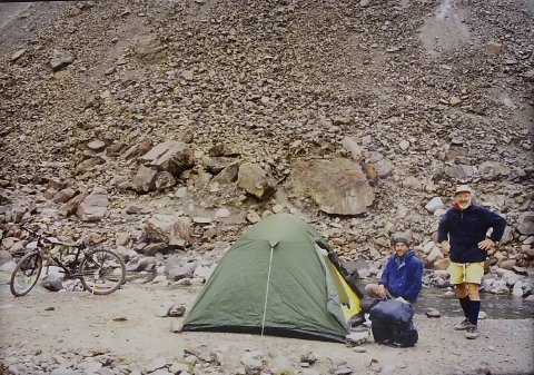 Efter 65 kilometer med 6-8 % stigning og strid medvind slår vi vores lille telt op ved floden nær en fårehyrdes forladte læskur. Vi befinder os nu knap 4000 meter over havets overflade. Højden og ikke distancerne er udfordringen her. Den famøse højdesyge er en reel risiko nu, men både Hans Bo og jeg slipper med lettere hovedpine. Vel nok mest fordi vi i de sidste par uger langsomt har vænnet os til højden og den tynde luft. Senere på aftenen begynder det at sne, og vi frygter, at vi ikke kan nå passet.
