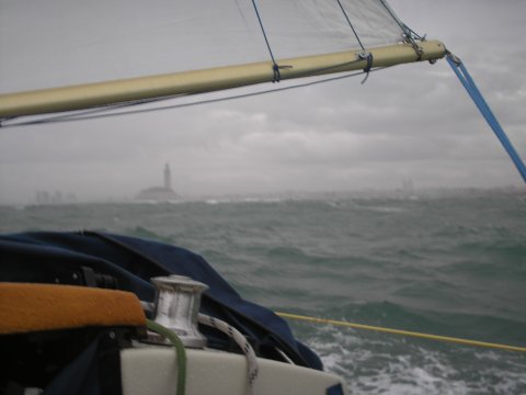 Efter et par dage med svage vinde nød jeg godt af en frisk brise fra sydvest 5-6 dage i træk, inklusive en lavtrykspassage med vind af kulingstyrke. De dage gav mig det afgørende skub i den rigtige retning. På turens sidste dage døde vinden desværre, og jeg oplevede perioder med tåge og derfor meget ringe sigtbarhed. Det kom ikke helt uventet, da der ofte er tåget langs Bretagnes kyst. Det sidste døgn udviklede sig til lidt af en prøvelse: nær øen Ouessant - Frankrigs nordvestligste punkt - er der en trafik-separeringszone, som man ikke kan undgå at passere, og hvor den tunge trafik fra Biscayen smutter rundt om hjørnet og ind i Den Engelske Kanal og vice versa. I sandhed et nervepirrende døgn, hvor sanserne arbejdede på højtryk, og hvor jeg drømte længselsfulde drømme om den radar og det AIS-udstyr, jeg desværre ikke havde ombord. Lettet var jeg, da jeg endelig slap fri af de store skibe, og solen brændte tågen væk, så jeg fik landkending og kunne sende en glædelig sms til min kæreste.