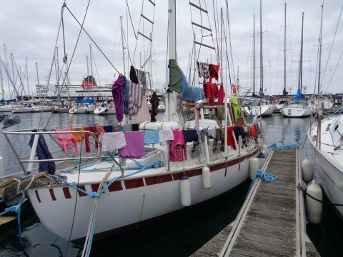 Vi er 4 langtursbåde her, og alle glæder vi os over at ligge godt i læ bag de tunge trawlerne. Den sidste sejler, en spansk båd, ankom denne morgen. Men da havnen ofte kun kan anløbes, når tidevandet tillader det, måtte han tilbringe en halv dag for anker i brændingen uden for havnehullet. En læ kyst, uha-uha, lidt af en risikabel rutchetur! Men hunden, der stop på fordækket, nød tydeligvis løjerne. Både den spanske besætning og vi andre sejlere var lettede, da vandet steg og båden endelig kunne glide ind i læ bag molehovedet.